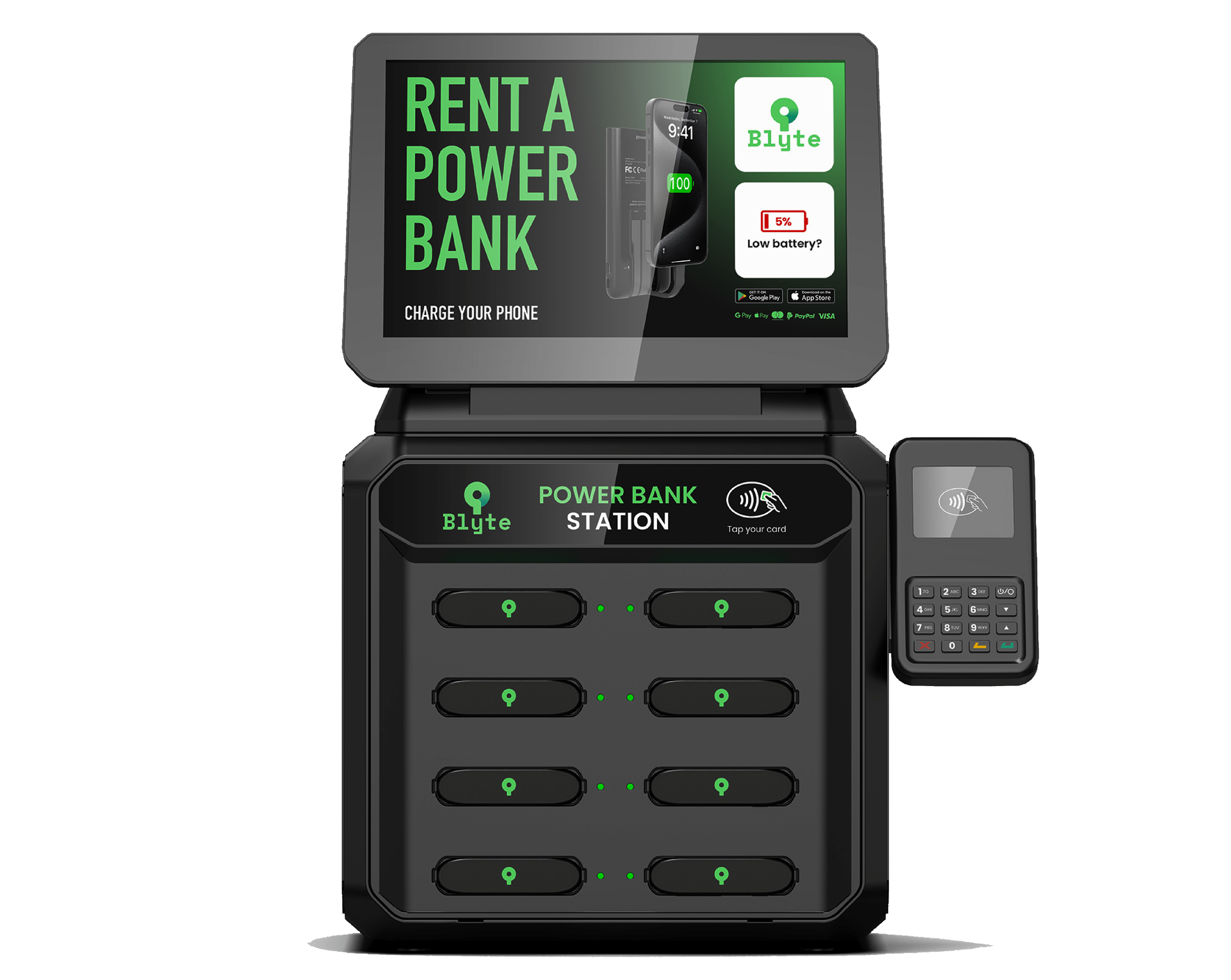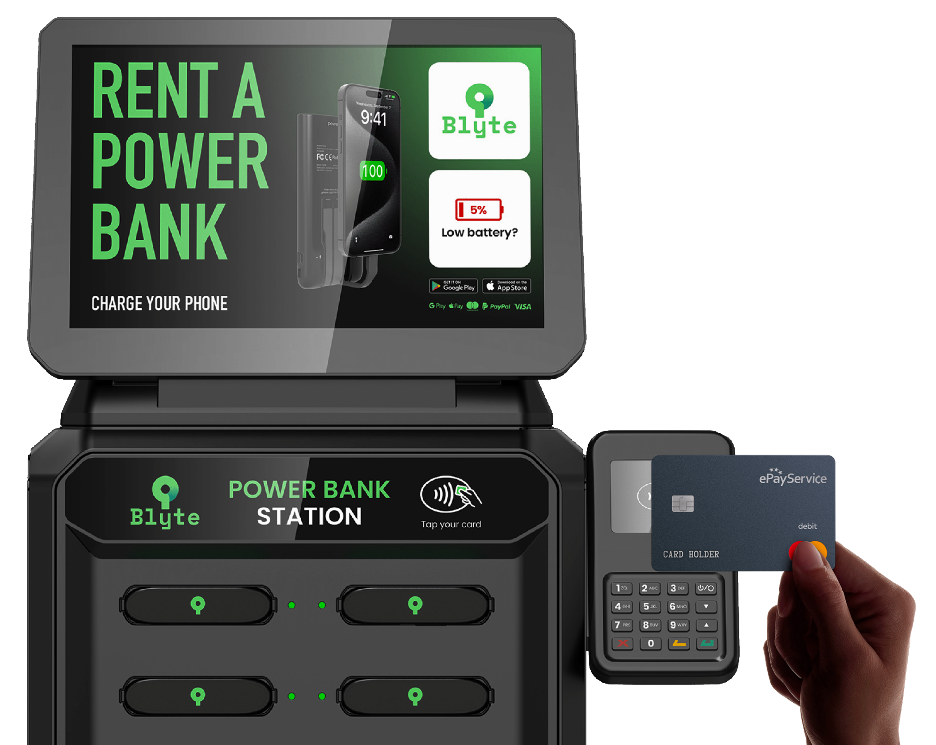 Il vous suffit d’approcher votre carte bancaire du terminal Blyte pour déclencher immédiatement la location et obtenir une batterie en quelques secondes.