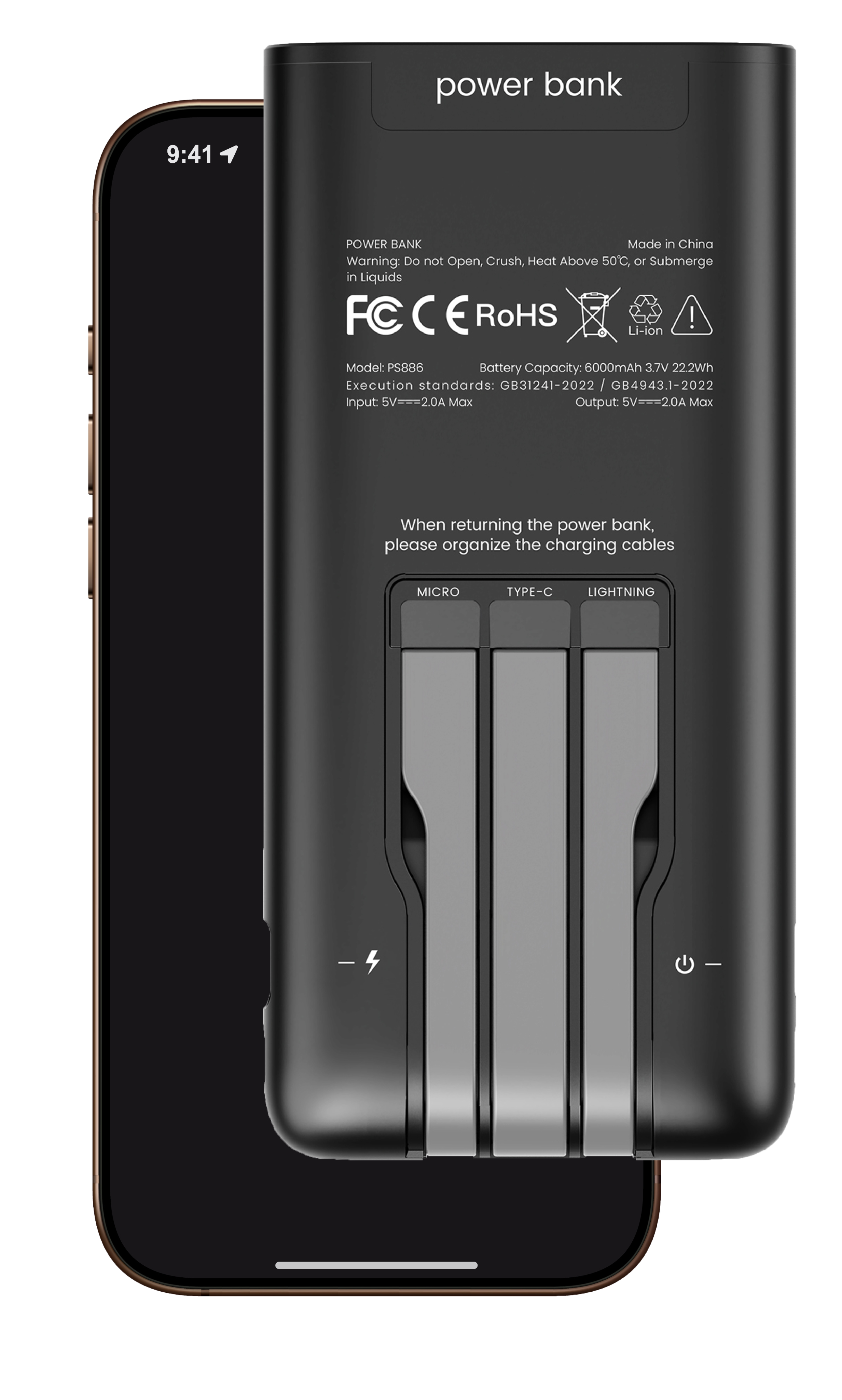 Nos batteries intègrent directement les câbles essentiels (USB Micro-B, USB Type-C et Lightning).